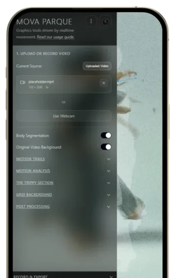 Mova Parque is a suite of video editing tools for creators that leverage state of the art machine learning to experiment with content inspired by the body's movement. Create realtime audio-visual assets that visualize and sonify movement.